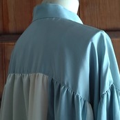 ヨークと袖は無地の水色、身頃は生成りの同系色をパッチワークして使っています。